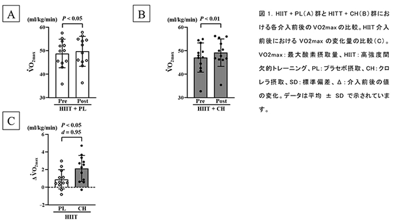 方法:3週間のHIIT(週3回、20秒×6〜7セット、170% VO₂max)とクロレラまたはプラセボの摂取(15錠×朝夕)