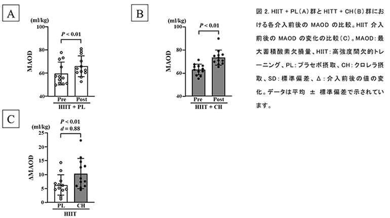 Study 1:HIIT 後、両群ともVO₂max、MAOD が有意に上昇しました。クロレラ群の増加量はプラセボ群よりも有意に高くなりました(図1、2)。