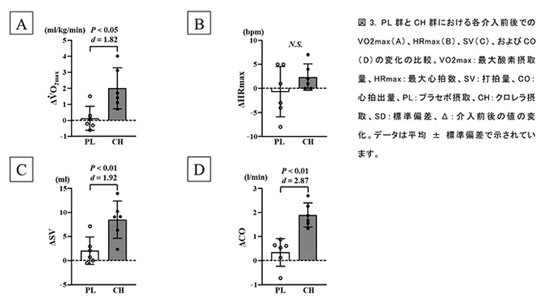 Study 2:クロレラ摂取により、最大運動時のCO とSV が有意に増加しました。その増加はクロレラ摂取によるO₂max の増加と有意に相関していました(図3)。